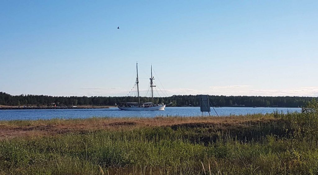 Laivaväylää pitkin Liksärin ohitti purjelaiva, jota sataman väki kertyi ihailemaan ja kuvaamaan. Kyseessä oli Ruotsin merivoimien koulutusalus HMS Falken.